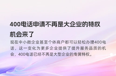 过去,400电话的申请门槛较高,主要面向资金雄厚的大型企业。现在中小微企业甚至个体商户都可以轻松办理400电话,这一变化为更多企业提供了提升服务品质的机会,400电话已经不再是大型企业的专属特权。