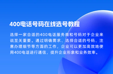 总之,选择一家合适的400电话服务商和号码对于企业来说至关重要。通过明确需求、选择合适的号码、注意办理细节等方面的工作,企业可以更加高效地使用400电话进行通信,提升企业形象和业务效率。