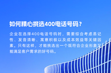 综上所述,企业在选择400电话号码时,需要综合考虑易记性、发音清晰、寓意积极以及成本效益等关键因素。只有这样,才能挑选出一个既符合企业形象又能满足客户需求的好号码。