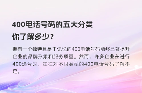 拥有一个独特且易于记忆的400电话号码能够显著提升企业的品牌形象和服务质量。然而,许多企业在进行400选号时,往往对不同类型的400电话号码了解不足。本文将详细介绍400电话号码的五大分类,帮助企业更好地理解并选择最适合自己的号码。