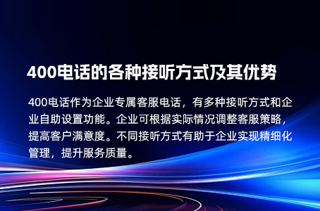 400电话是企业专属客服热线的一种形式,它是一种虚拟号码,无需实体设备,主要通过与手机或固话进行绑定来实现接听。其独特之处在于,电话号码数量不受限制,接听方式多样,企业能够根据自身实际情况进行自由设置。下面,我们将详细探讨400电话的各种接听方式及其优势。