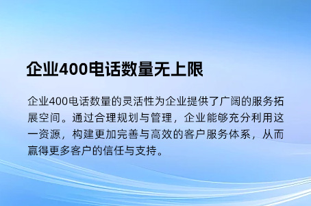 总之,企业400电话数量的灵活性为企业提供了广阔的服务拓展空间。通过合理规划与管理,企业能够充分利用这一资源,构建更加完善与高效的客户服务体系,从而赢得更多客户的信任与支持。